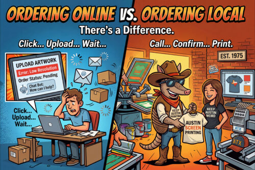 At Austin Screen Printing, our in-house art department reviews every job. Need adjustments? Tweaks? Not sure what file you have? We’ve got you.
